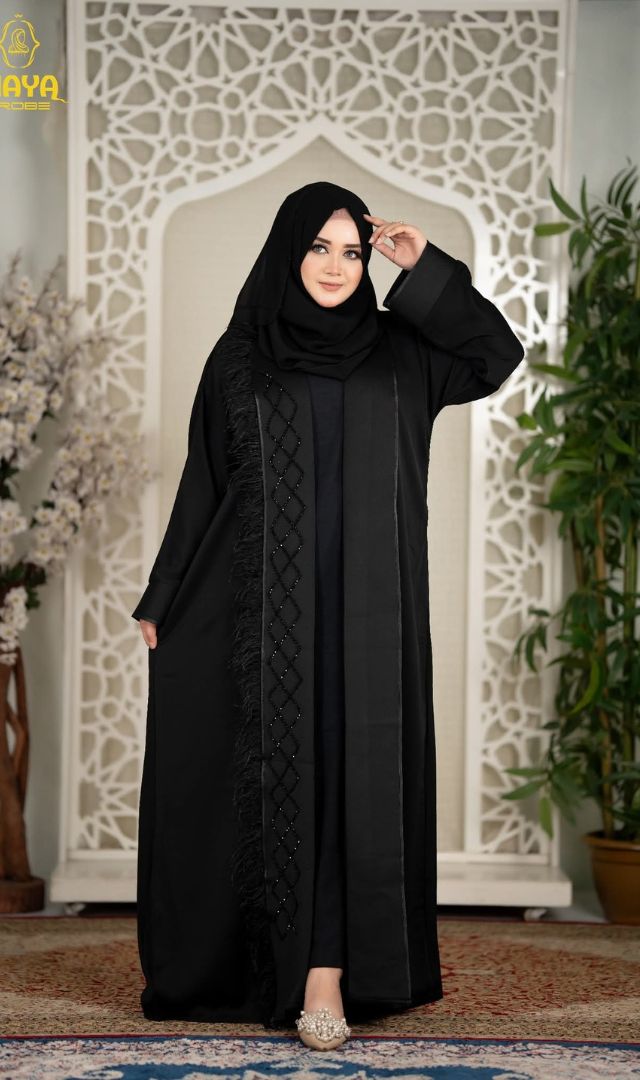 This image features a woman modeling a luxurious black Premium 2-Part Koti Borka, perfect for contemporary modest fashion. The front is beautifully accented with a textured panel that includes elegant embellishments and subtle feather detailing, creating a refined yet modern look. The outfit is completed with a matching black hijab and sparkling footwear, adding a touch of glamour. Ideal for formal events, religious celebrations, or exclusive occasions, this borka combines sophistication and tradition in one timeless ensemble.